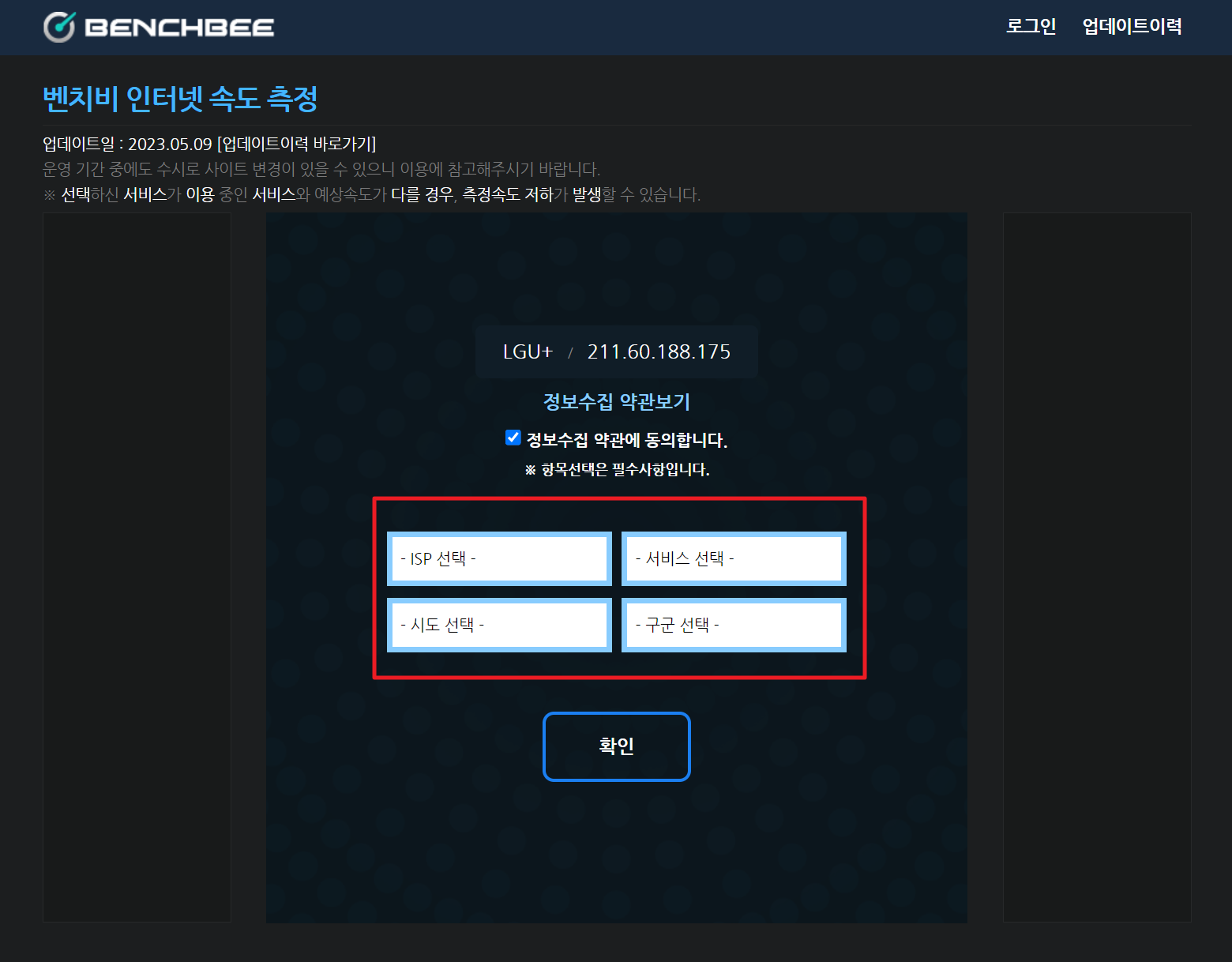 통신사, 가입한 속도, 시도, 구군 선택 후 확인버튼 >