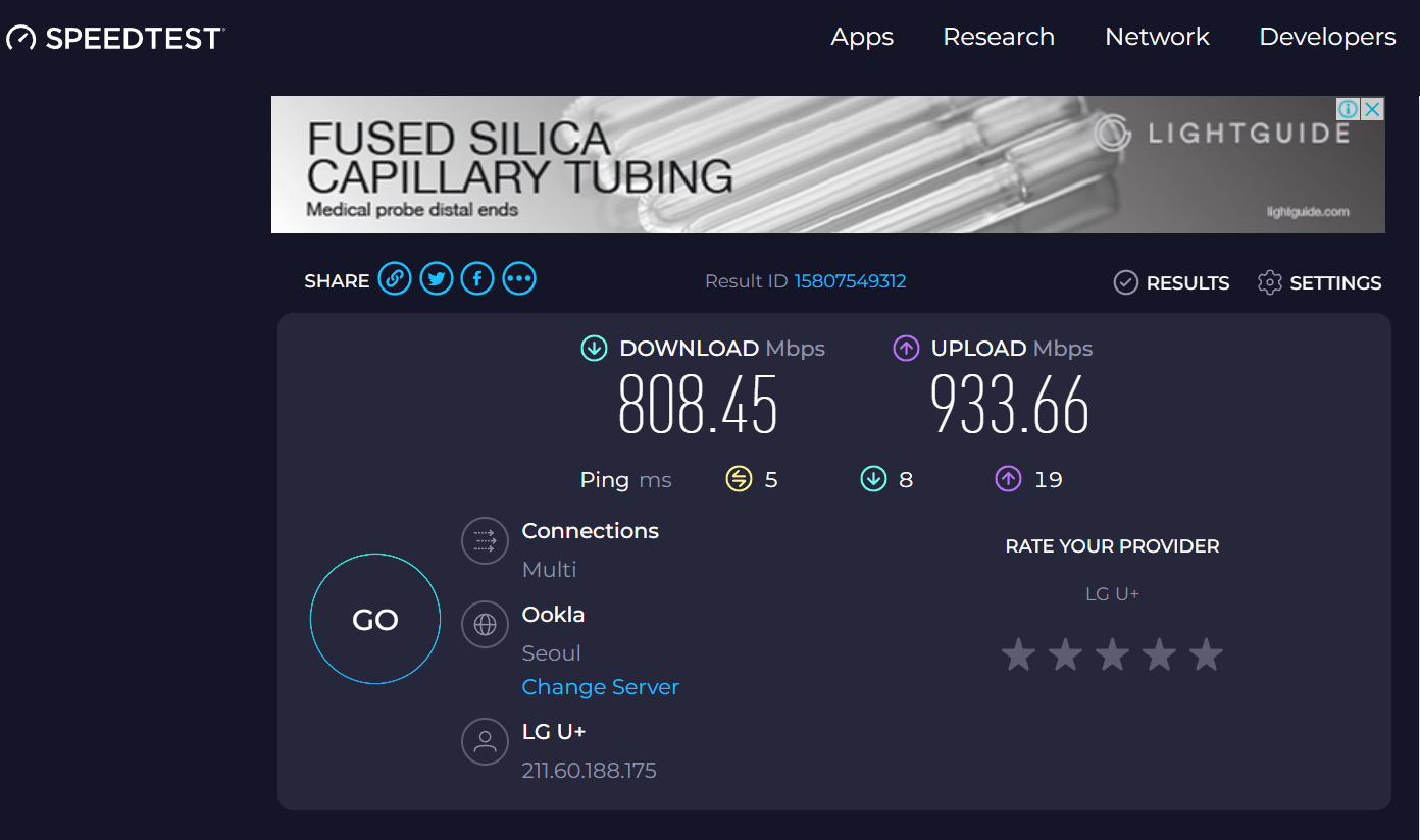 Ookla의 Speedtest는 사이트 접속후 GO 버튼만 누르면 자동실행되어 간단하고 빠르게 속도 측정이 가능합니다.